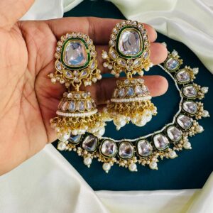 Premium Craftsmanship: Oversized Kundan stones with green enamel detailing and bead hangings.